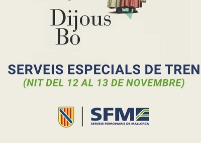 - Servicios especiales de Tren con motivo del Dijous Bo en Inca, 42 más que los habituales, hay por la tarde y se programan trenes nocturnos durante la madrugada a Manacor y Palma